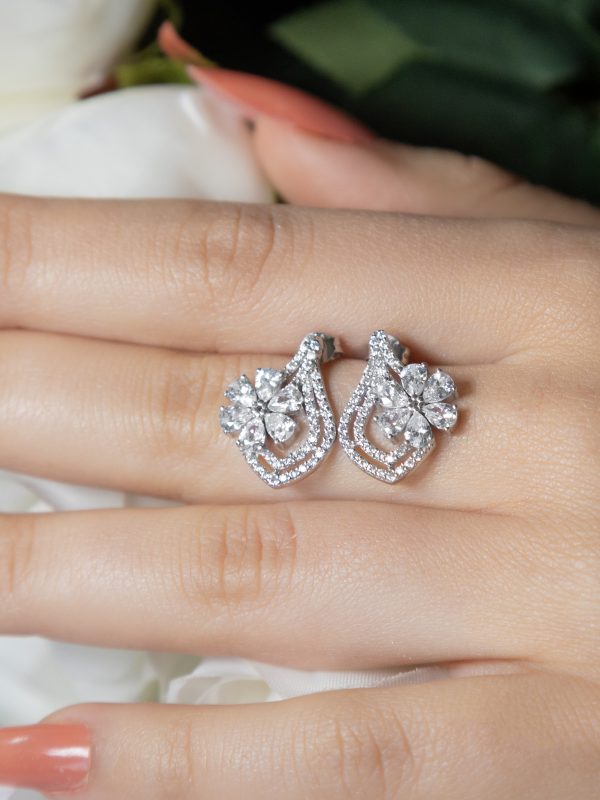 حلق فضة بتصميم قطرة مزينة بزهرة مرصعة بأحجار براقة لامعة🌾